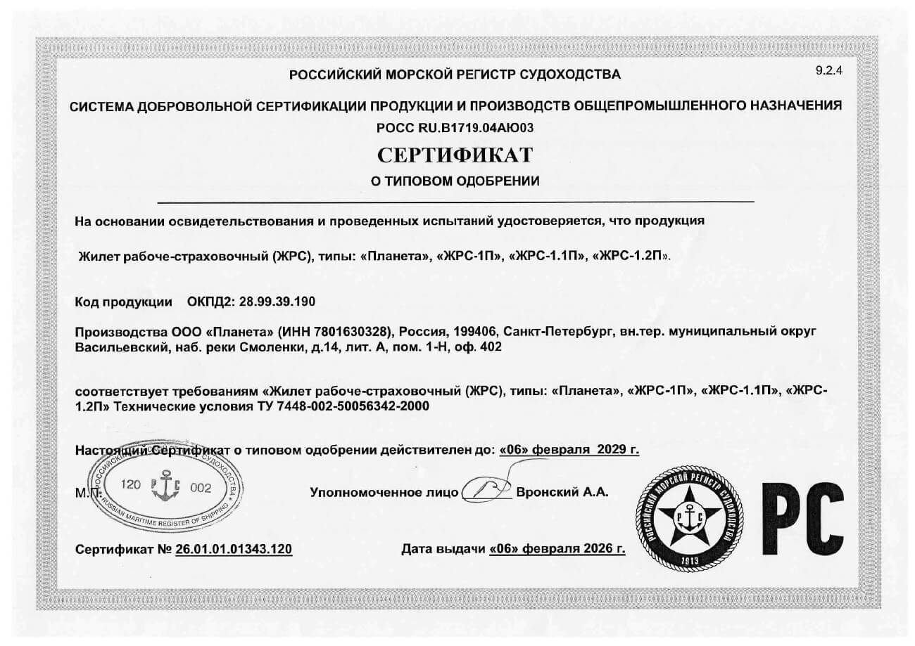Жилет рабоче-страховочный соответствует требованиям ТУ 7448-002-50056342-2000 и имеет сертификаты Морского и Речного Регистров в системе добровольной сертификации.